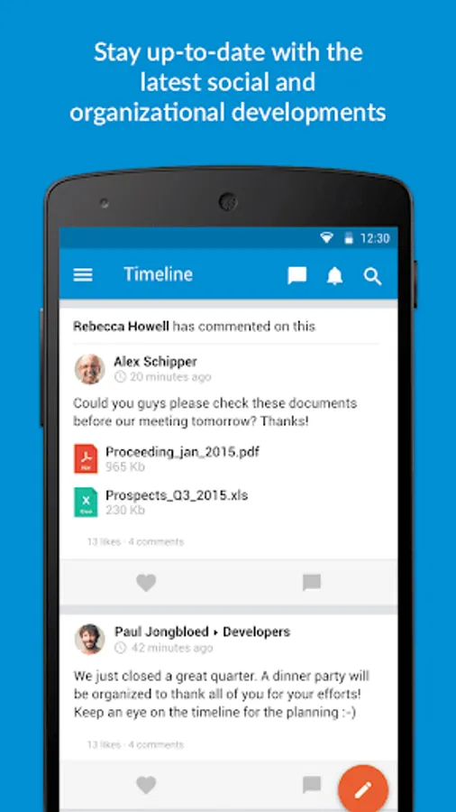 Share new knowledge, ideas and internal achievements quickly and easily with the rest of your team, department or organization. Enrich messages with pictures, videos and emoticons. Simply keep track of new posts from your colleagues, organization and partners.