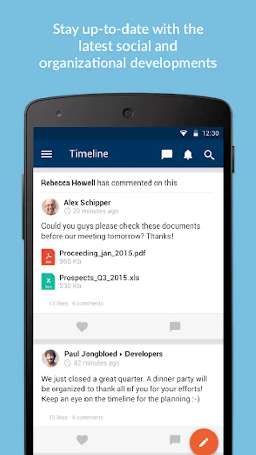 Share new knowledge, ideas and internal achievements quickly and easily with the rest of your team, department or organization. Enrich messages with pictures, videos and emoticons. Simply keep track of new posts from your colleagues, organization and partners.