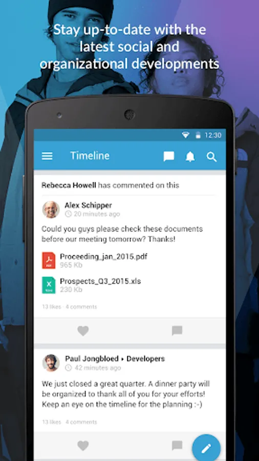 Share new knowledge, ideas and internal achievements quickly and easily with the rest of your team, department or organization. Enrich messages with pictures, videos and emoticons. Simply keep track of new posts from your colleagues, organization and partners.