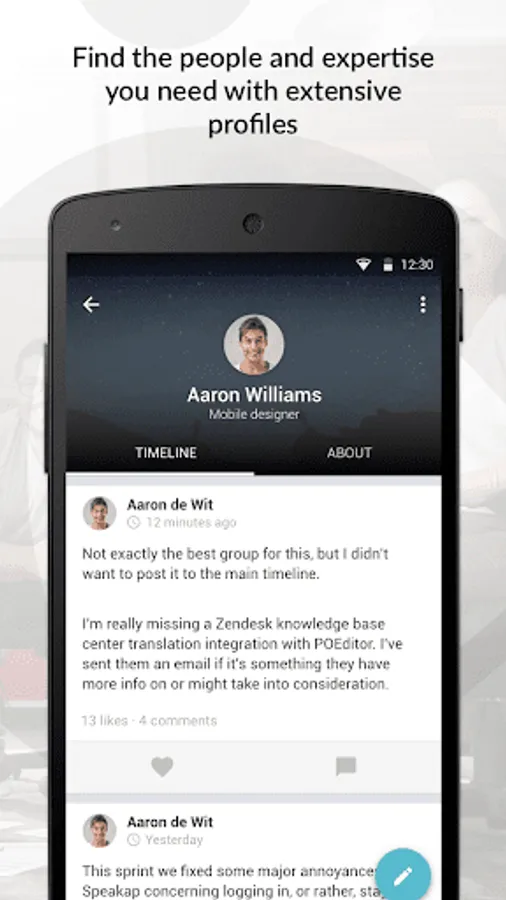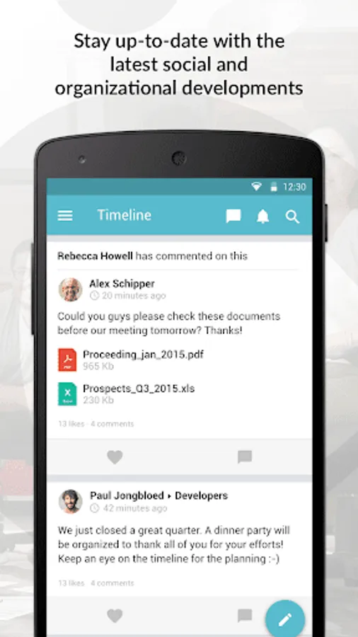 Share new knowledge, ideas and internal achievements quickly and easily with the rest of your team, department or organization. Enrich messages with pictures, videos and emoticons. Simply keep track of new posts from your colleagues, organization and partners.