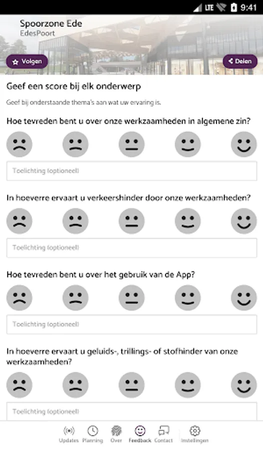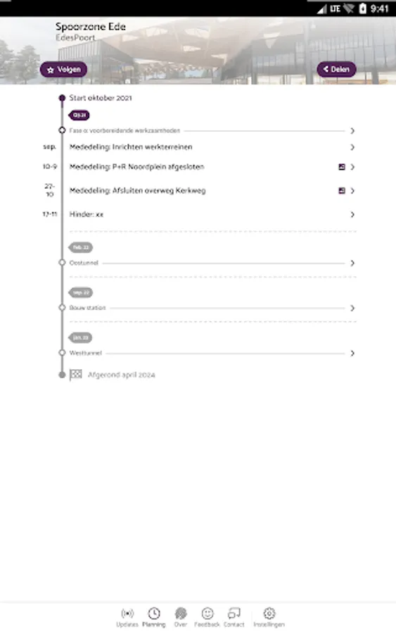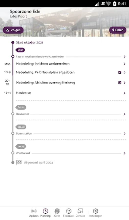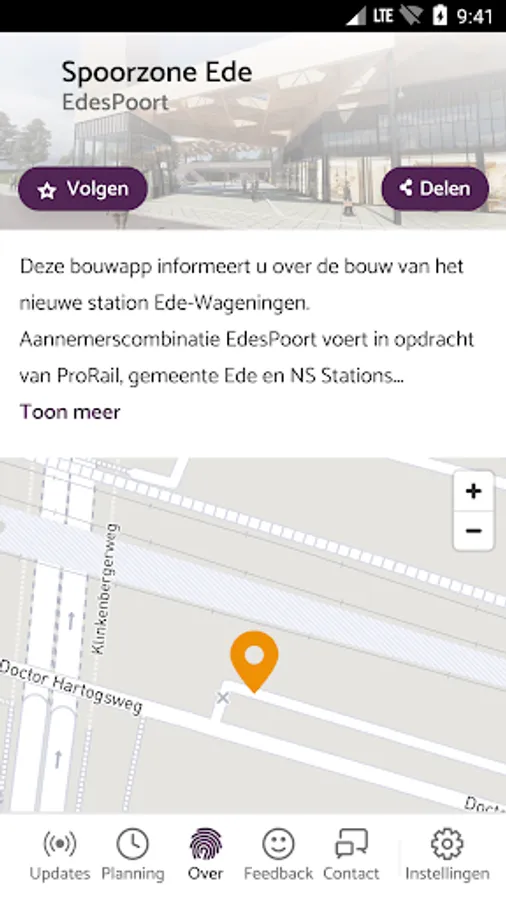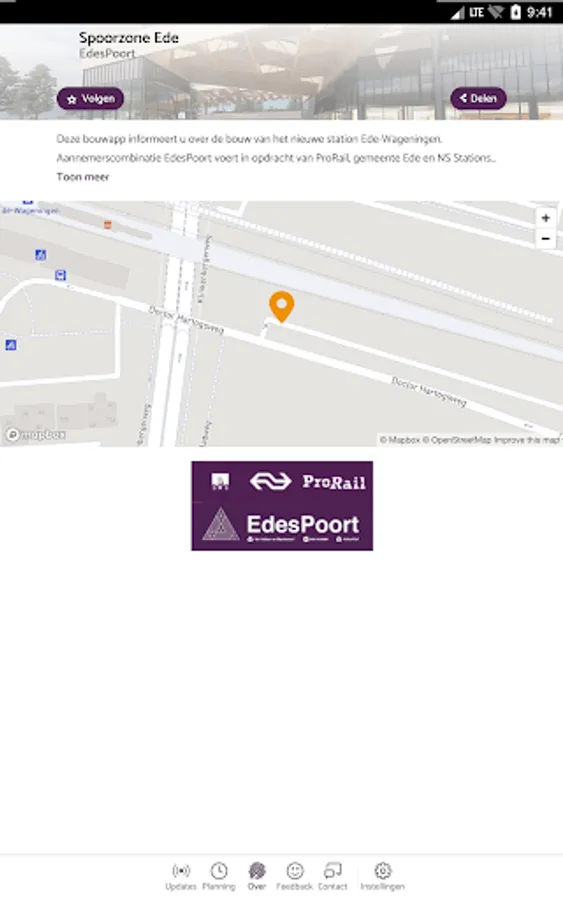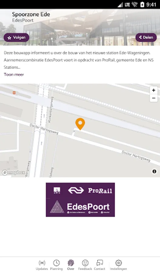 The App Spoorzone Ede informs you about the construction of the new station Ede-Wageningen. Construction consortium EdesPoort is carrying out the work on behalf of the municipality of Ede, NS Stations and ProRail. These include the construction of the new station, adaptation of the rail infrastructure, construction of two platform tunnels and a new slow traffic bridge. In the app you will find images, information about the planning and possible nuisance as a result