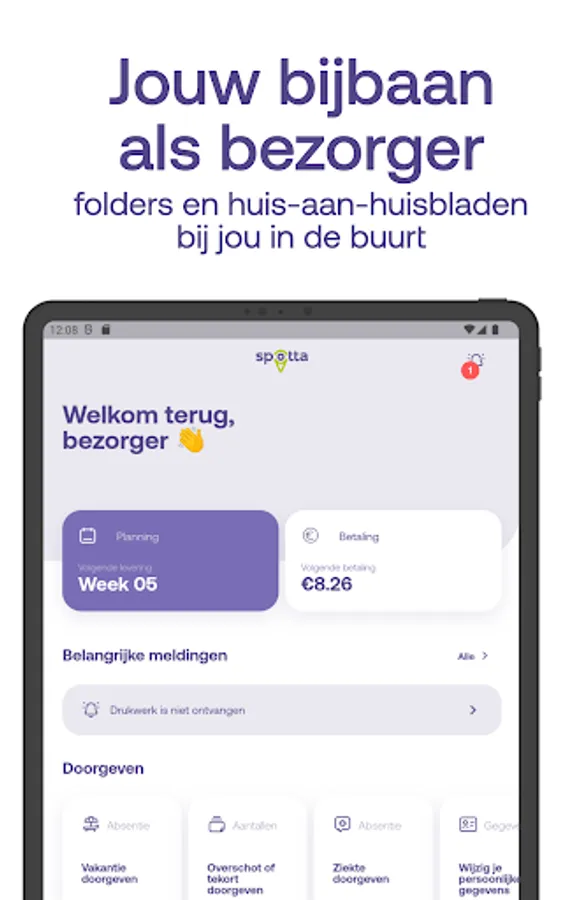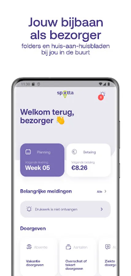 In de Mijn Spotta app heb je altijd en overal inzicht in de informatie die je nodig hebt om je folderwijk te lopen. Zo kun je gemakkelijk zien wat je bezorgvergoeding is en wanneer je uitbetaald krijgt. Daarnaast kun je altijd je stratenplan terugvinden en zie je wat je de volgende bezorgweek kunt verwachten aan folders of extra verspreidingen.