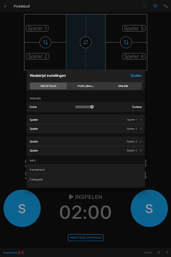 All the standard side-out scoring match formats are included. In addition, there are timers for match warm-up, time-outs and end changes. These timer periods default to standard values, but can be fully user defined.