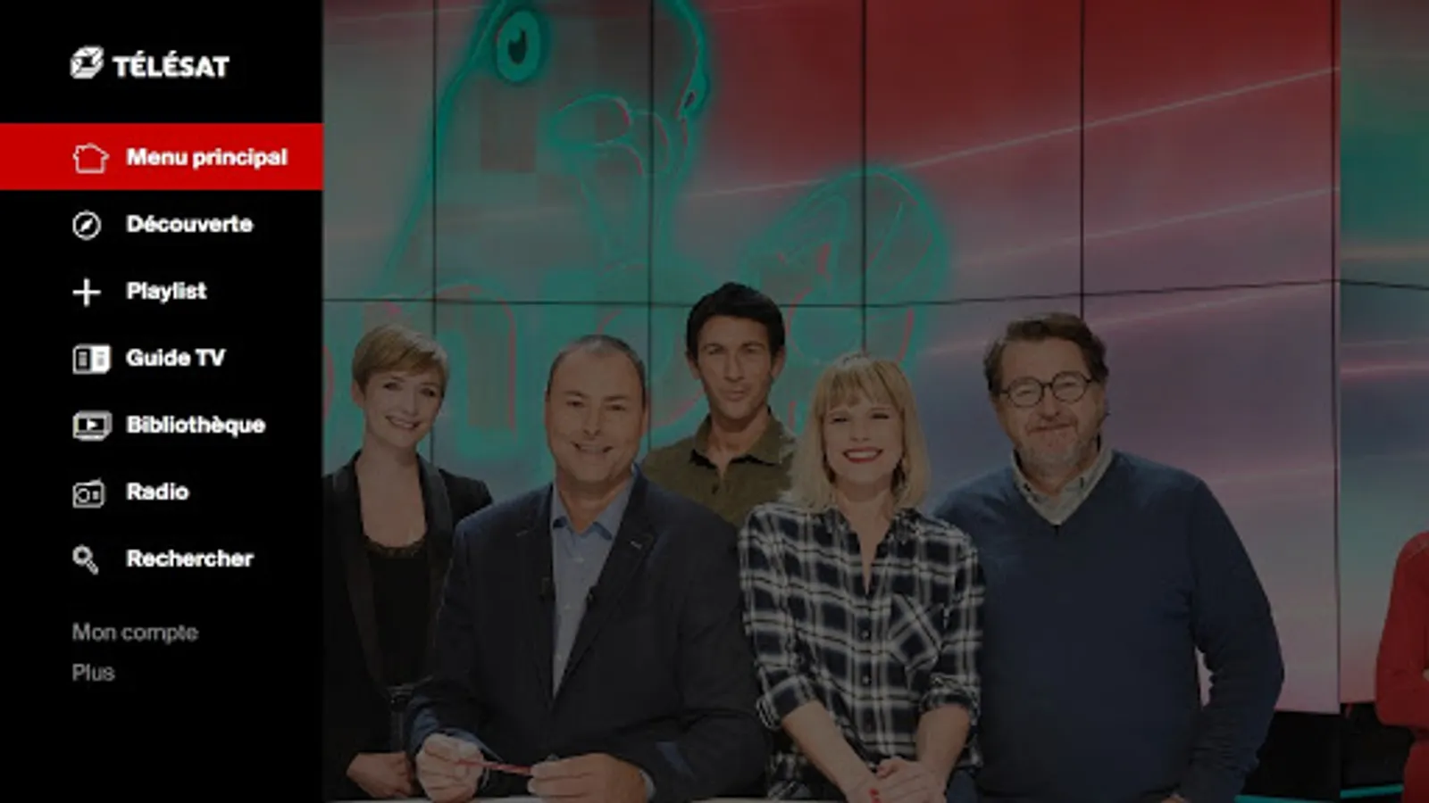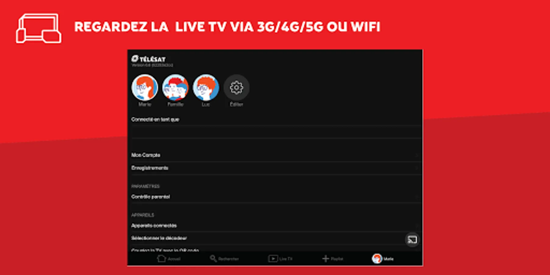 • Use your TELESAT credentials to watch TV anywhere. Don't you have one yet? Go to https://www.telesat.be/espaceabonne/creer-un-compte/ to create your account (automatically activated if you have an APP TV subscription).