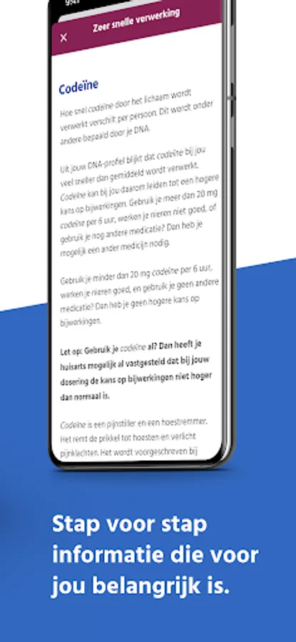 In this app you can download the technical report of your Pharmacogenetic Passport as a PDF file and email it to your (general) doctor and/or pharmacist, or take it printed to the practice or pharmacy. In this way, they can provide even better tailored advice about medicines that someone is currently using or may use in the future. For certain medicines in the app, we expressly indicate that it is wise to discuss this with the (general) doctor and/or pharmacist.
