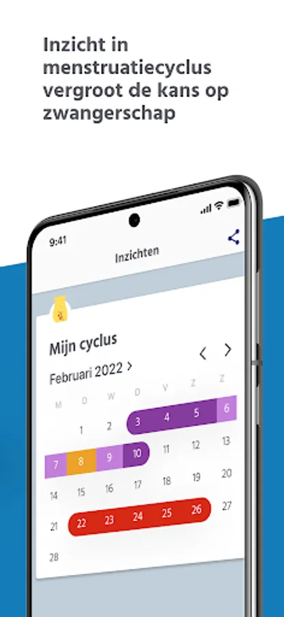 In addition, you can keep track of your period in the app, which can be used to calculate when you have increased fertility. The chance of pregnancy is then the greatest. This is not a guarantee of pregnancy, by the way. Entered data will not be shared with healthcare providers or others.