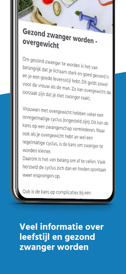 The information in this app is prepared and managed by healthcare professionals. It contains reliable information for couples about getting pregnant. In the profile you can indicate whether you want extra guidance in your desire to have children. You will then receive additional information and messages about the matters that are important when becoming pregnant. There are no costs involved.