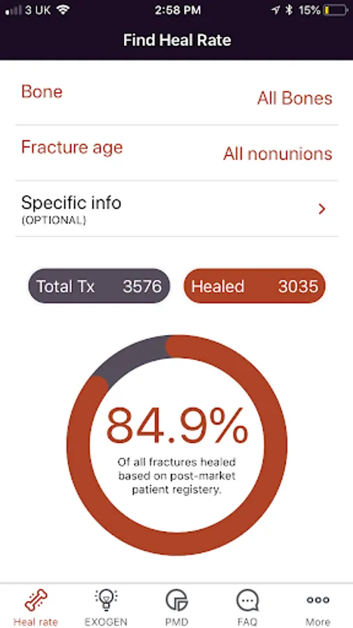 This App has been developed to support your review of the data. Within this App, there are multiple references to fracture types and heal rates by bone. Bioventus welcomes you to review the data for the most applicable information relevant to your practice.