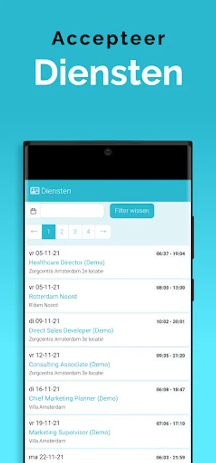 With this App you as a flex worker of We Care Mediation can view and accept services and assignments, register hours worked, draw up and send invoices, view time sheets and the agenda.