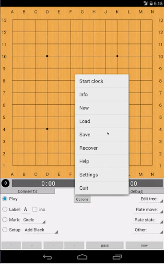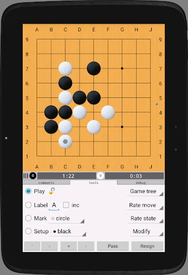 - Optional debug tab shows GTP streams (the communication between GUI and engine), rules issues, and provides option to send gtp commands manually (double-tap or long-press to pop up dialogs).