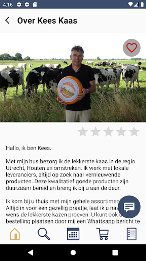 Met mijn bus bezorg ik de lekkerste kaas in de regio Utrecht, Houten en omstreken. Ik werk met lokale leveranciers, altijd op zoek naar vernieuwende producten.  Deze kwalitatief goede producten zijn duurzaam bereid en breng ik bij u aan de deur.