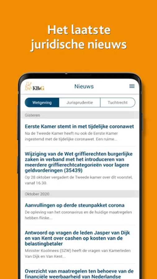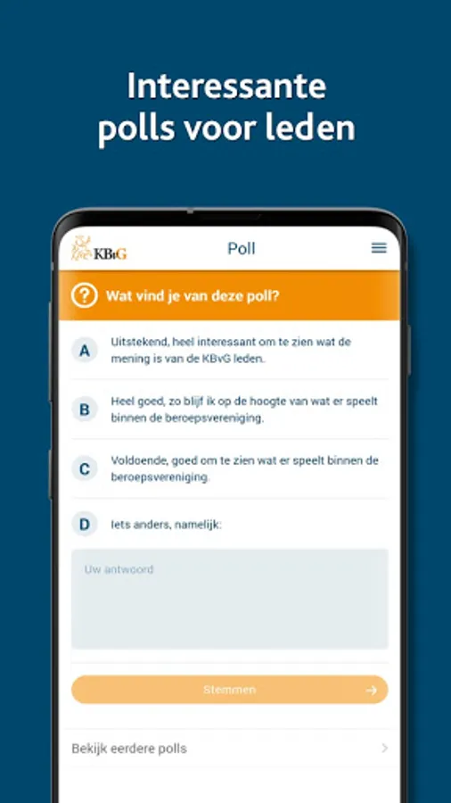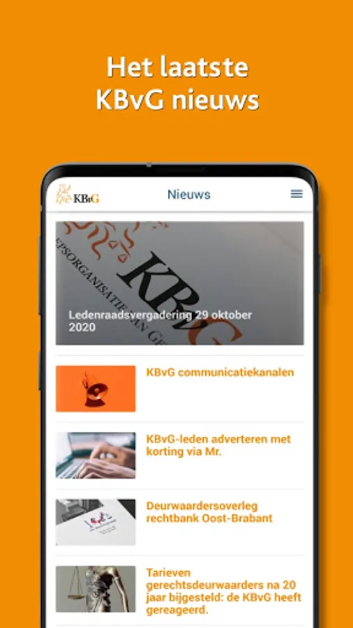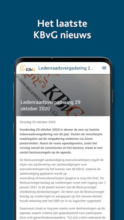 The Royal Professional Organization of Bailiffs (KBvG) is a professional organization governed by public law of which all Dutch bailiffs are mandatory members. The KBvG app can only be used by KBvG members. KBvG members can use the app to read and respond to news items, participate in polls, consult the KBvG website and consult My KBvG.