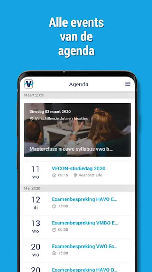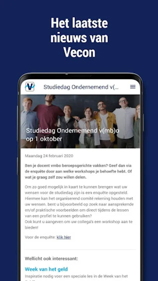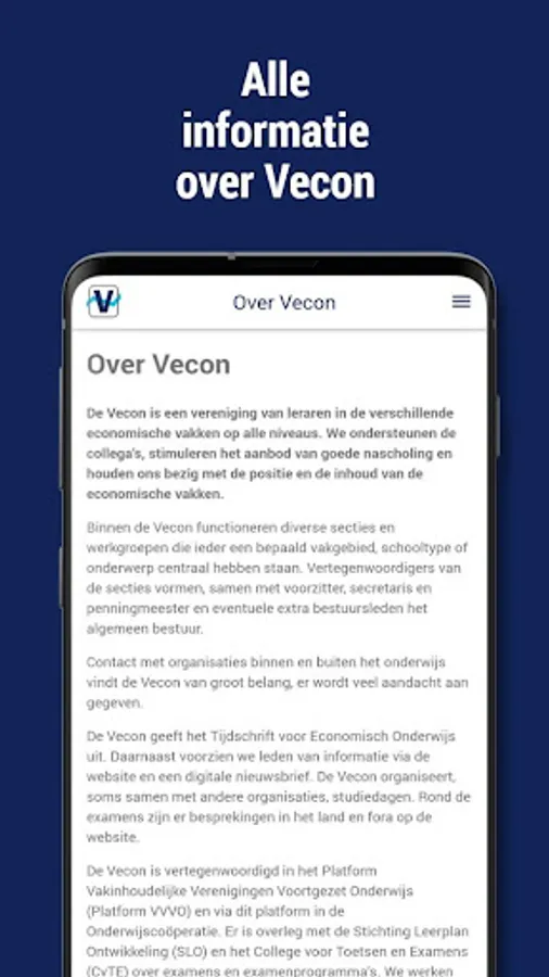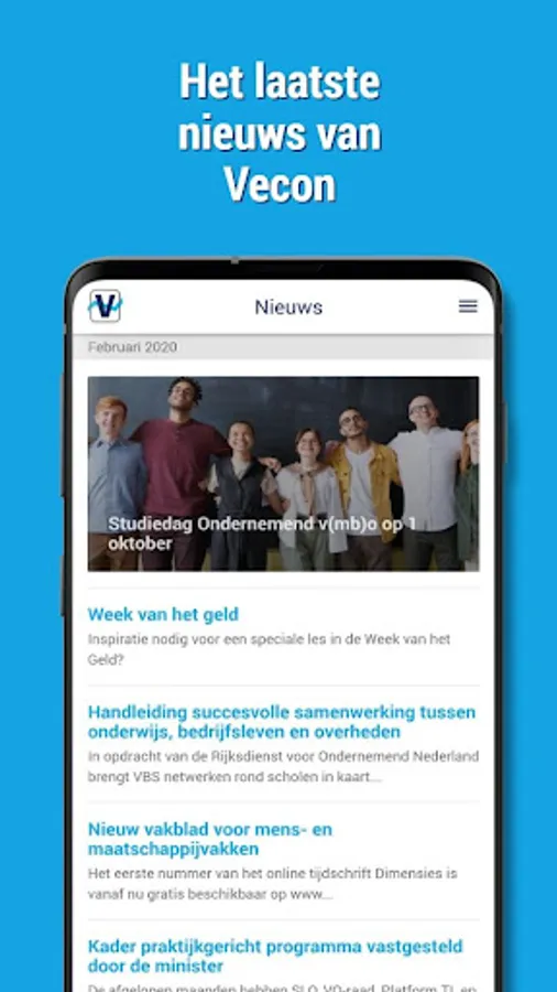 De Vecon is the association of teachers in economic / social subjects. VECON BUSINESS SCHOOL is a foundation that promotes attention to economic subjects, entrepreneurship and entrepreneurship in education, including by certifying schools. Via the app you can find information about these organizations, about events that are organized and knowledge that is shared via, for example, the Magazine, the digital newsletter and the Knowledge Base.