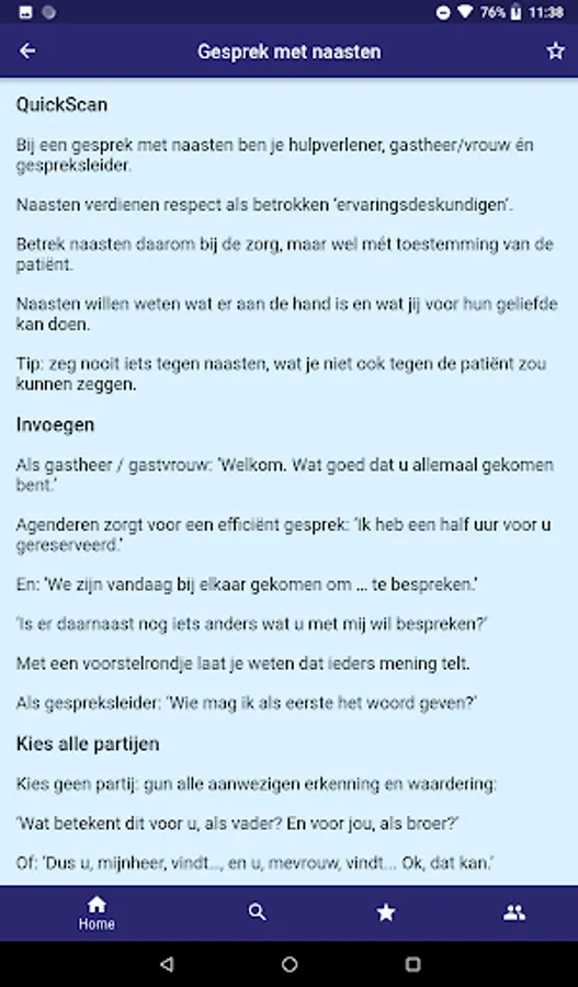 MedCom is a unique care communication app that allows you to prepare for a conversation with patient or client in less than 15 seconds. The conversation skills are patient-oriented: besides respectful and effective, as much as possible scientifically responsible. Handy for in the doctor's office, at the ward or at the patient's home.