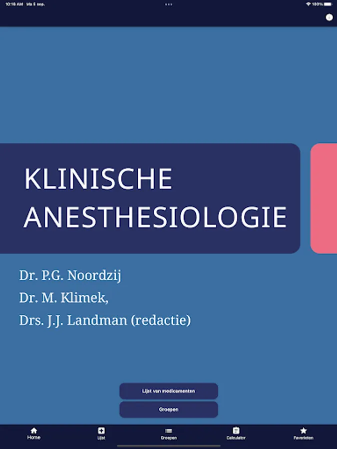 The content of the application consists of a list of commonly used anesthesiological agents with clearly arranged information about dosages, properties, mechanisms of action, indications, warnings and pharmacology of the various medicines. The application is particularly suitable for quick reference while working in or outside the operating theater complex and intensive care unit. This application is based on the chapter Pharmacology from the new book Clinical Anesthesiology edited by Noordzij, Klimek and Stamer. The application is particularly suitable for the anesthetist (in training), intern, nurse anesthetist, ICU doctor (in training) and ICU nurse. The application will be regularly updated with new information. These updates are free.