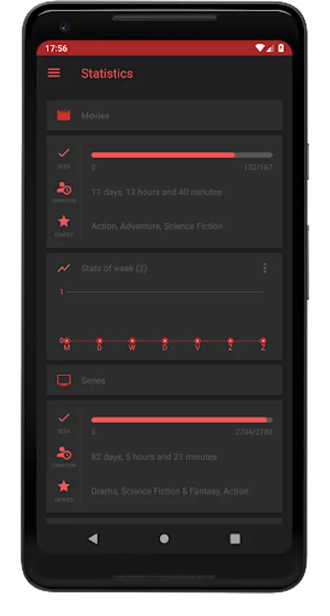 • Get an overview with statistics of your viewing behavior based on the data that is only present on your device or on Trakt (if connected with Trakt).
