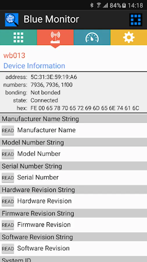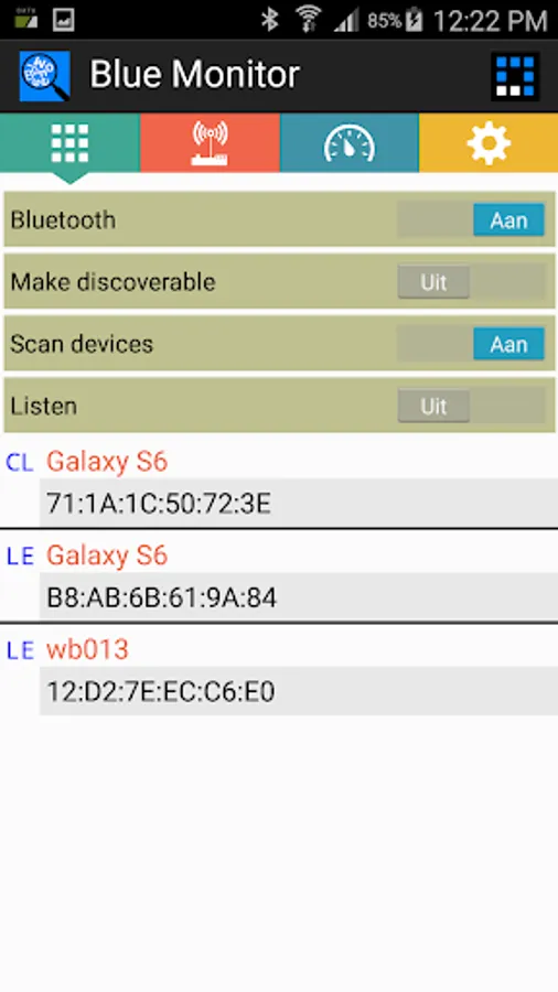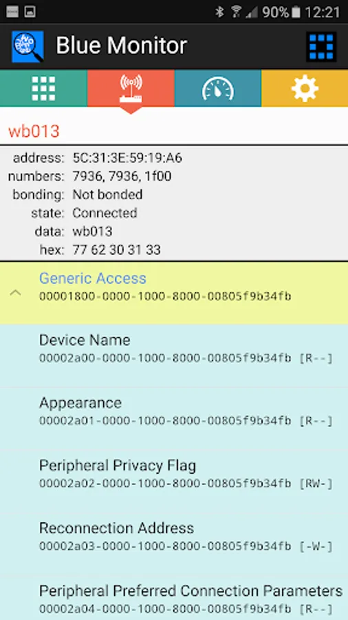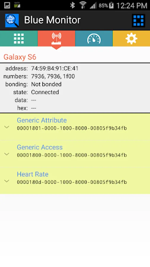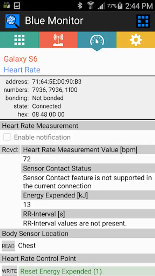 This app “Blue Monitor” handles services of Bluetooth devices, both classic as well as Bluetooth Low Energy (BLE). N.B. For BLE scan turn location ON !!! While scanning, a remote device can be selected resulting in een overview of its offered services. All characteristics of a selected service are listed, including values of readable characteristics. Notified characteristics are updated when received. Certain services are elaborated, enumerating there (parts of) characteristics in detail. These services are: Device Information, Battery Service, Heart Rate.