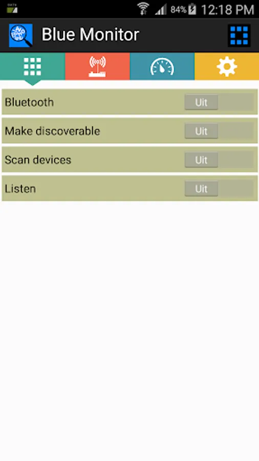 The Blue Monitor is able to act as a client as well as a server. It can listen to a service, chosen in the Settings Screen. In particular, the SerialPort service has been implemented. This allows 2 devices to exchange text messages. So, when acting as a client : select the SerialPort service of a connected device. Or, when acting as a server: choose the (default) SerialPort service via Settings and then switch Listen ON in the Overview Screen.