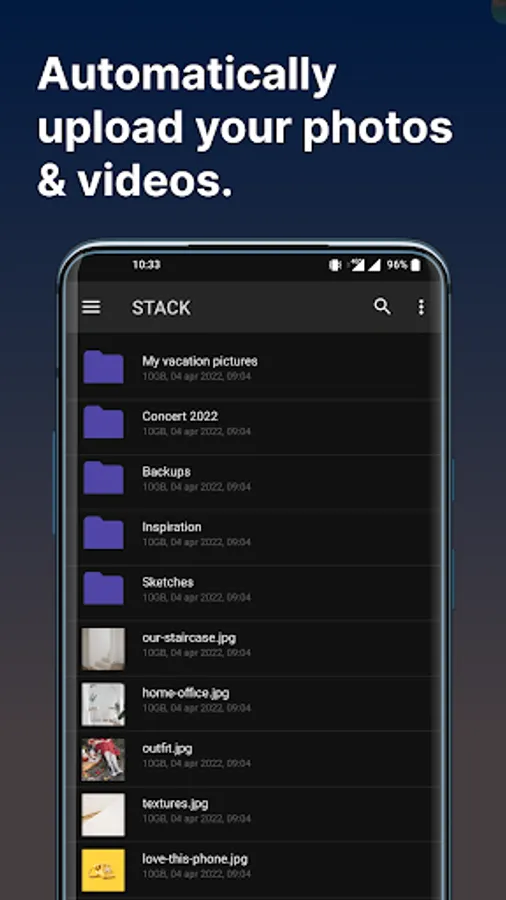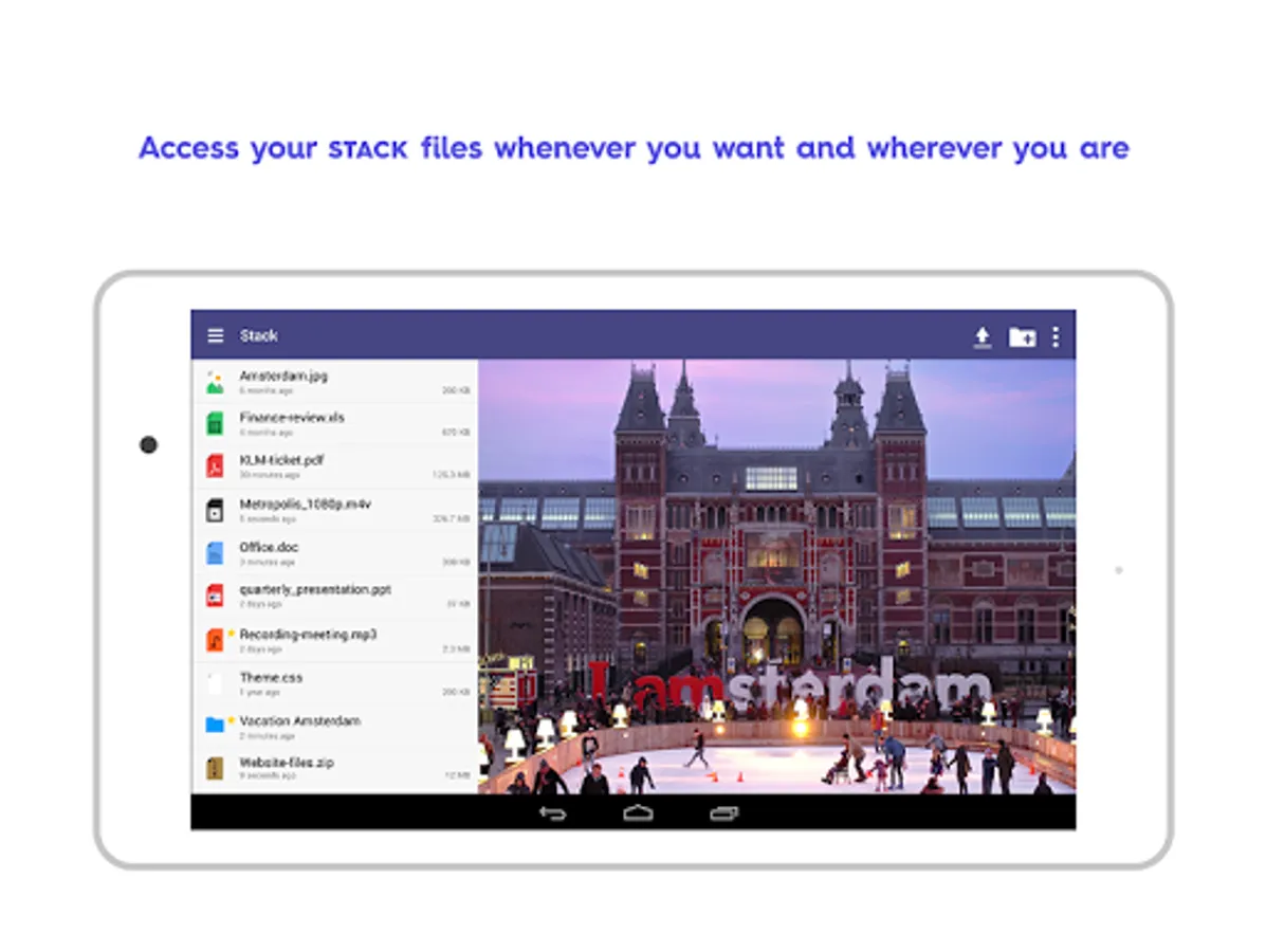 With STACK you can access, sync and share all your files on the go. Keep your personal files safe and securely stored in our datacenters in the Netherlands, even if your phone is lost or damaged. You can use STACK to access all of your files from any mobile device, desktop or your browser. Share a download link or send a file directly from the STACK Android application and stay in control of your shared folders. STACK allows for you to instantly upload from your phone’s camera to a chosen directory. Share your files with friends and family so they can always view your newest photos and videos.