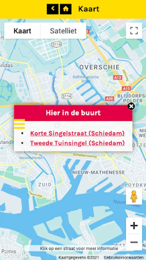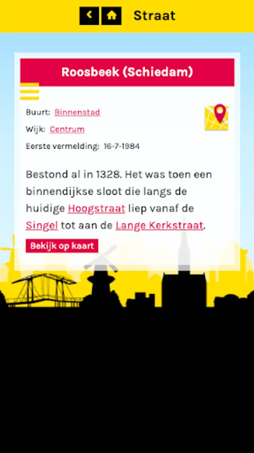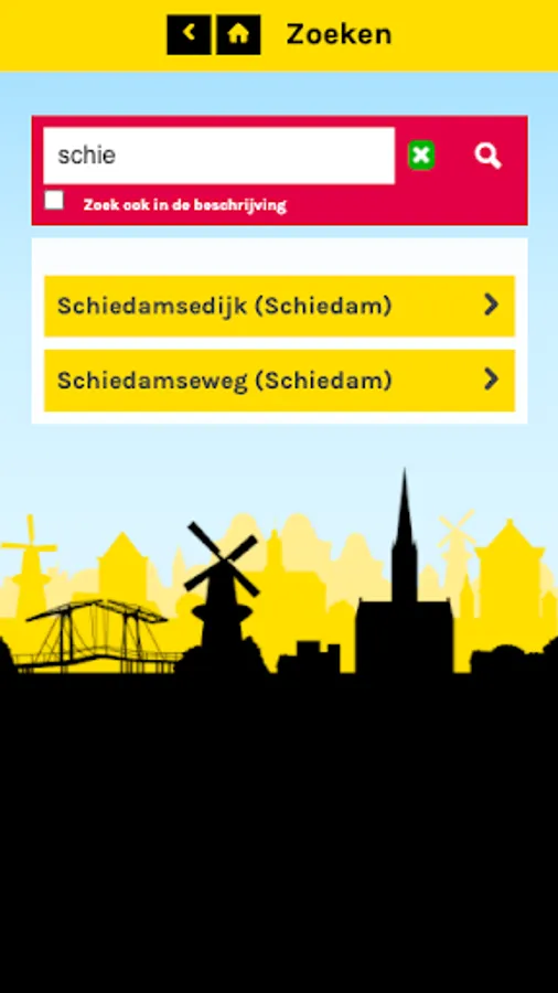 The app 'Street names of Schiedam' provides the origin and meaning of all street names in Schiedam. Wander the map looking for new street names. Search the database for people and words. Or discover on the street which street names are in the immediate vicinity. With the app 'Street names of Schiedam' you can learn more about the history of the city in a fun way.