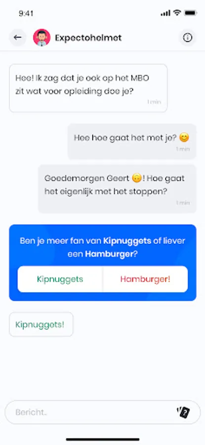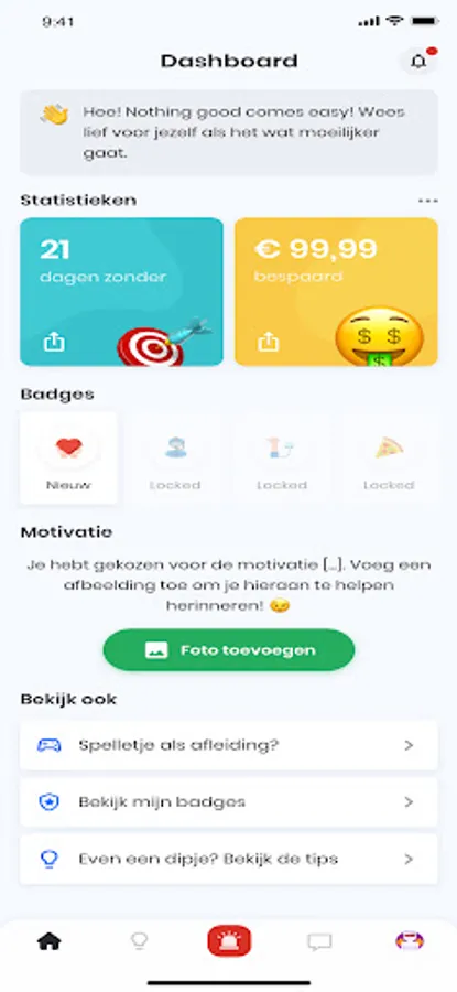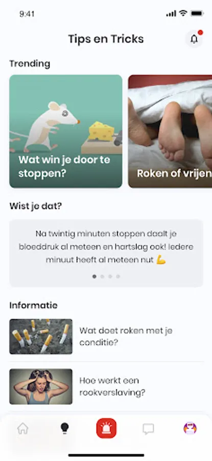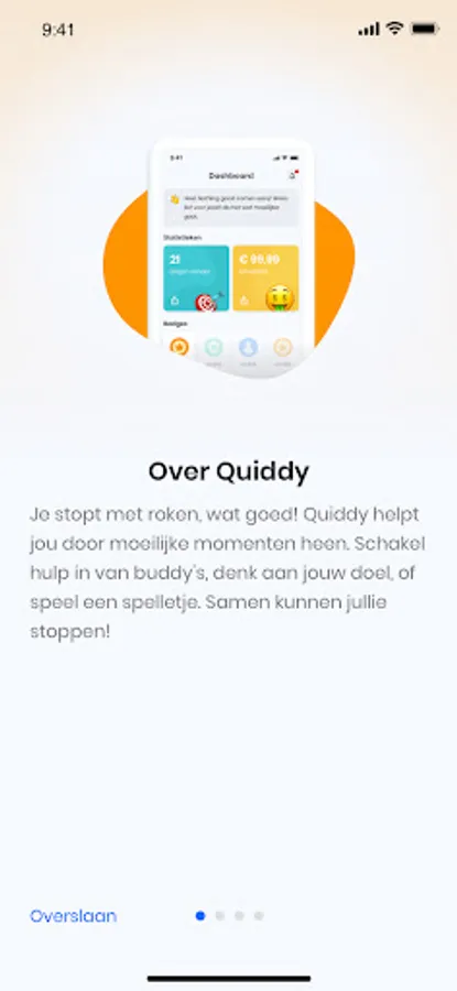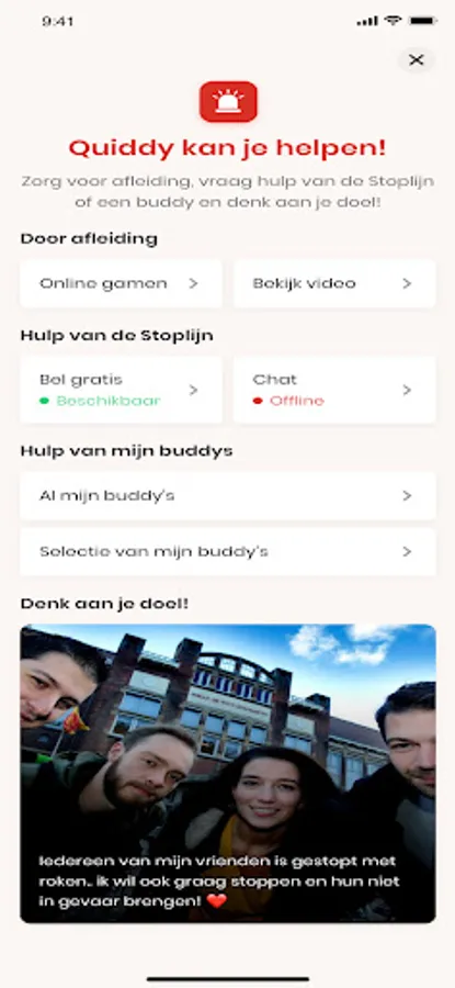 Quiddy helps young adults to quit smoking. The app matches you with someone who has the same goals or pitfalls. This can be done anonymously or with someone you know. You can help each other through the chat when the going gets tough. If you don't know what to talk about, you can send funny or serious statements to get to know your buddy better. If you feel like smoking, you can switch on your buddies via the emergency button. Via this button you can also get in touch with a professional who can advise you. Or you can play an online game to distract yourself. The app provides information about different ways to quit smoking and tips. The app keeps track of how many days you have stopped and how much money you have saved. With this you can earn badges! You can also add your own motivation to remind you why you want to quit smoking.