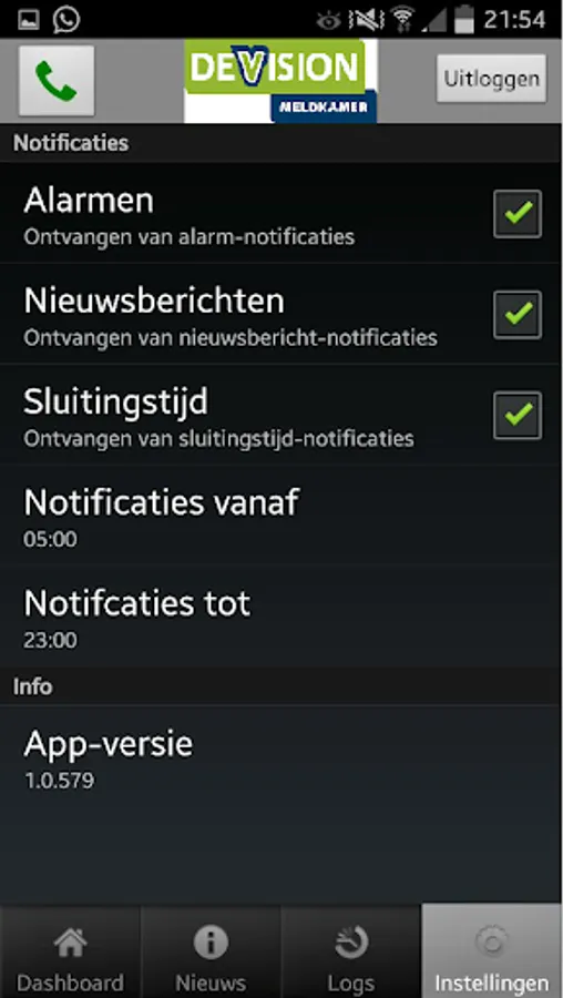 Met de Devision Mobile staat u continu in verbinding met de Devision Alarmcentrale. Op eenvoudige wijze kunt u controleren of het alarm van uw pand in- of uitgeschakeld staat. Daarnaast kunt u een notificatie ontvangen van een eventueel alarm, nieuwsberichten lezen, of uw overwerktijd aanpassen (bij bewaakte inschakeltijden).