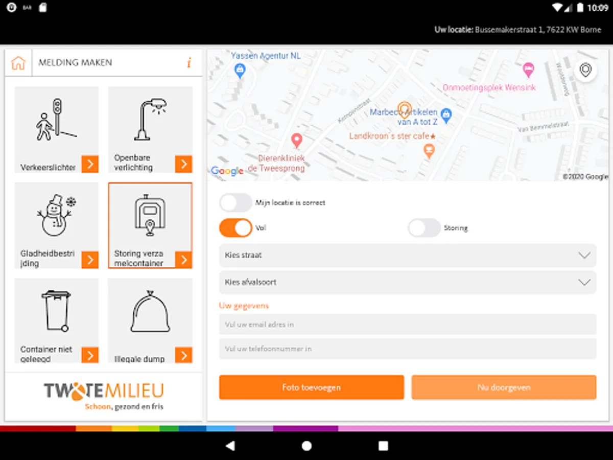 You can create reports of a fully underground container, a non-emptied container and illegally dumped waste. If you live in the municipality of Borne, you can also create reports of public spaces, such as loose paving stones, overhanging branches and nuisance dogs.