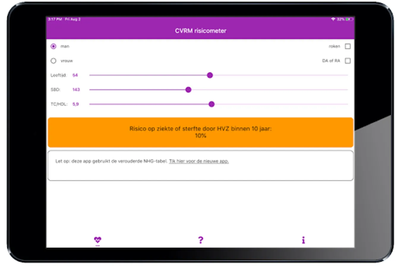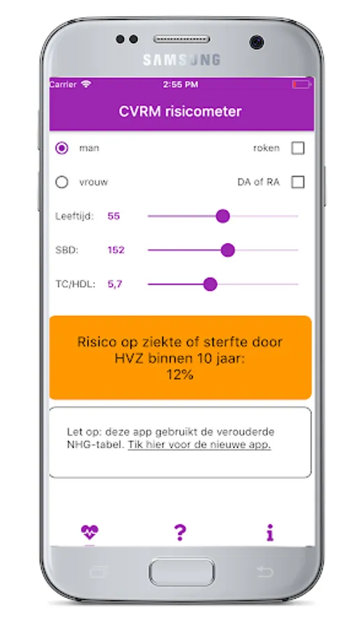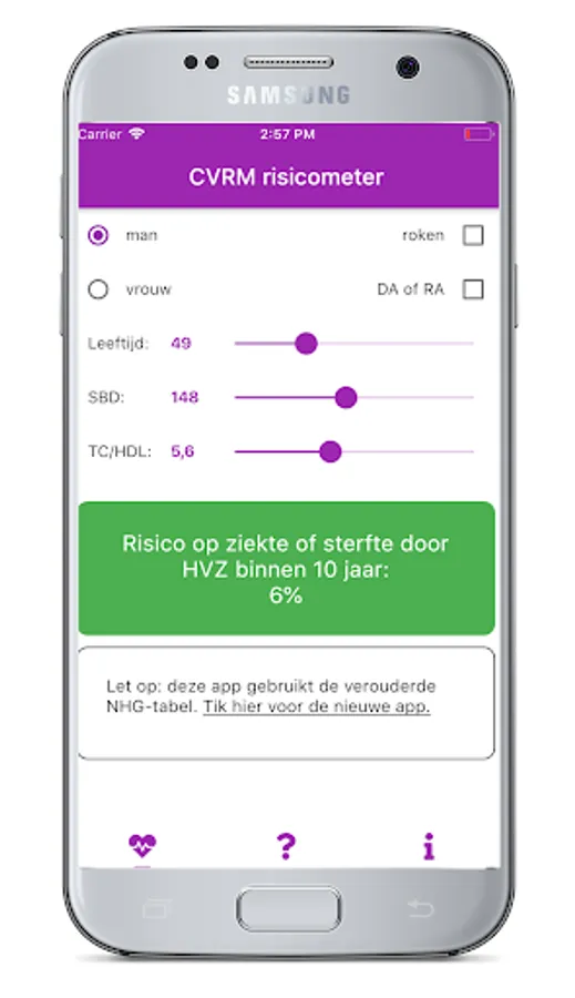 This app easily calculates the risk of disease or death from cardiovascular disease (CVD) within 10 years, based on the CVRM risk table from 2011 (multidisciplinary guideline CVRM, see for example NHG summary card M84). The app displays the data from the table and calculates intermediate values using NHG formulas. To determine in which HVR-risk group a patient falls, you need: the age, the systolic blood pressure or upper pressure and the TC / HDL ratio. You must also know whether the patient smokes, has diabetes mellitus or rheumatic arthritis.