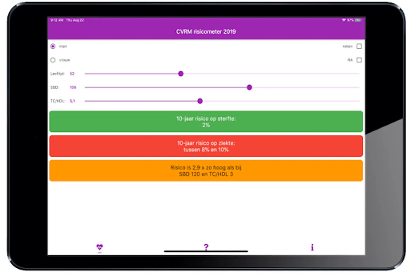 Based on personal characteristics and risk factors, this app immediately and accurately calculates the risk of death and disease due to CVD (ruin and upper limit). In addition, the app gives the risk increase compared to a patient with the same personal characteristics and an SBD of 120 and a TC / HDL ratio of 3.