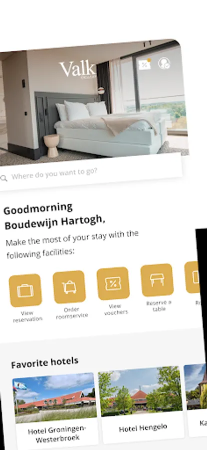 Reserve your table or book your overnight stay with our app. You will receive the booking confirmation by email. Check in easily, even before you arrive at one of our hotels. Use Mobile Key to open your room door and pay your bill immediately. You can also check out via the app. This way you can skip the line at the reception. Do you have a Valk Account? Then you can benefit from deals, discounts and promotions with our app. No account yet? Create it via the app and also save Valk Loyal credit.