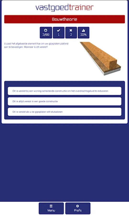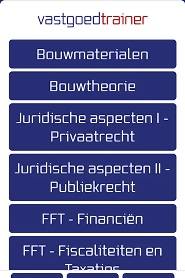 Real Estate Trainer is an app that allows you to prepare for the theory exam theory basis for the Diploma Candidate Register Real Estate Appraiser Housing (KRMT) of SVMNIVO. On the basis of multiple choice questions the subjects are tested in the exams. If you answer wrong you will get a brief explanation of why the answer is wrong.
