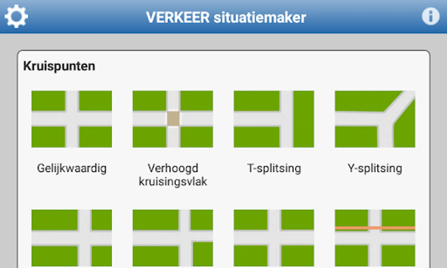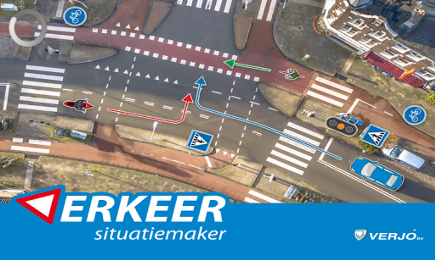 • At the traffic situation can be, different road users and objects (houses, trees etc) placed. Certain signs and objects have been placed at an intersection so as to quickly draw a situation. There is a wide choice of situation's (over 25), road (main), various road users (pedestrians, several vehicles and emergency vehicles (police, fire and ambulance)) and objects which can be chosen.