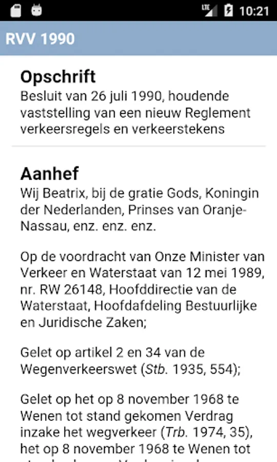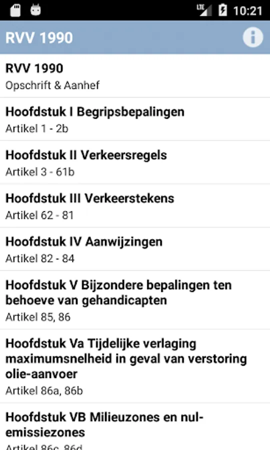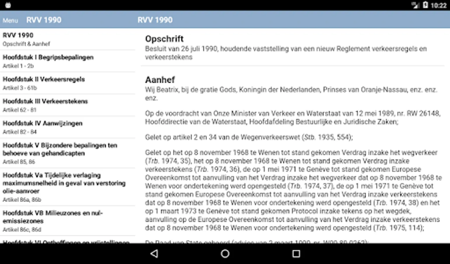 In the app, all sections of the RVV1990 (Traffic Rules and Signs 1990) included. The articles are no explanatory memorandum. Of course, the signs and indications recorded separately. To make the app are also complete the relevant articles of the 1994 Road Traffic Act and the Motor Vehicles driving lessons (WRM) in the app RVV1990.