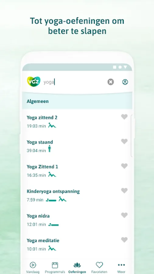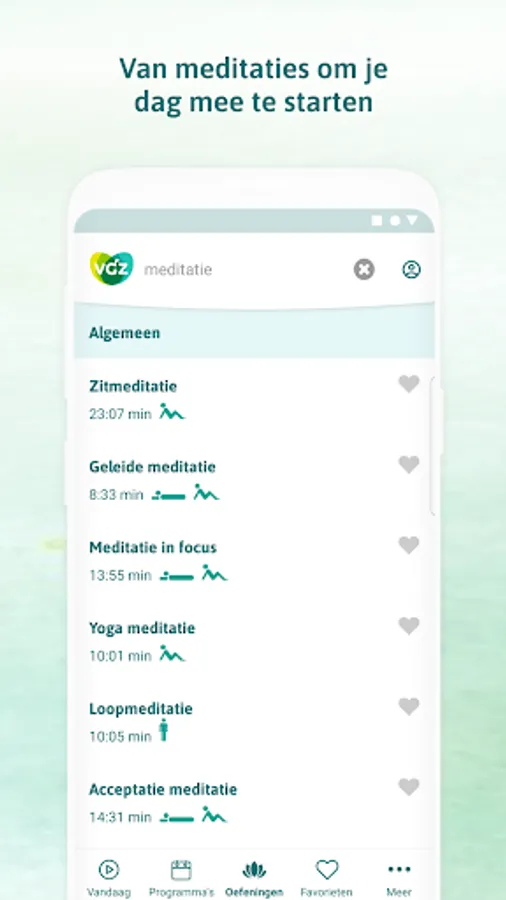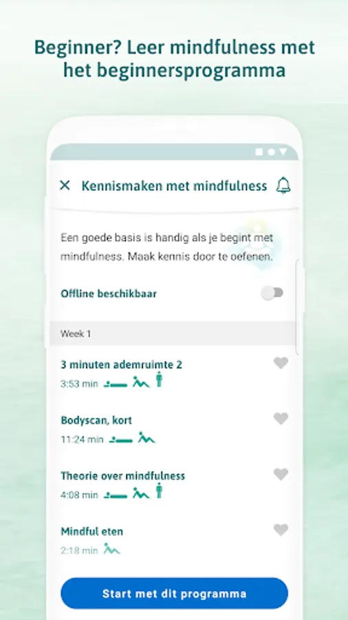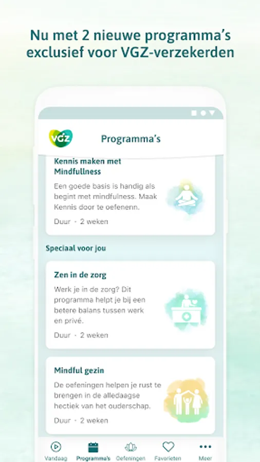 With the VGZ Mindfulness Coach app you learn to live more in the now. Choose a 2 week program. Or follow one of the 100 separate exercises, from meditation to (children's) yoga. All in Dutch. Choose a voice (male or female) and follow the exercise whenever and wherever you want. There is always an exercise that fits into your schedule.