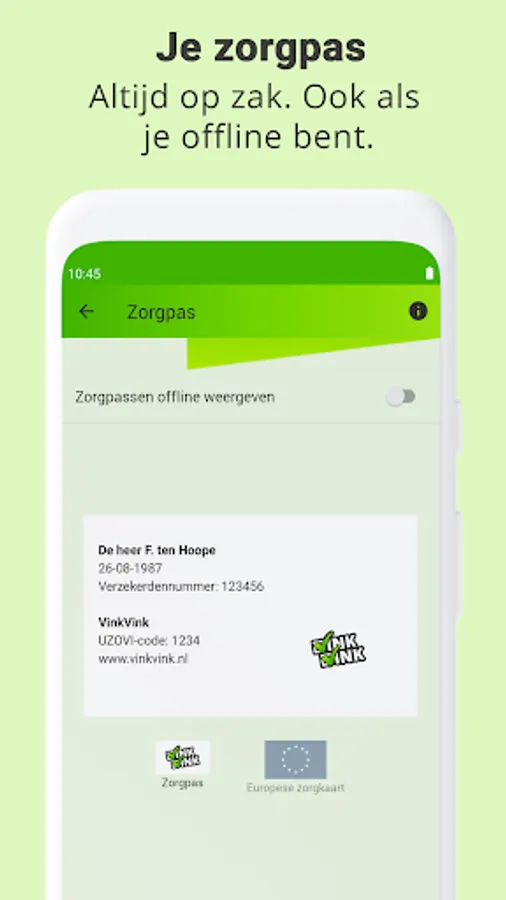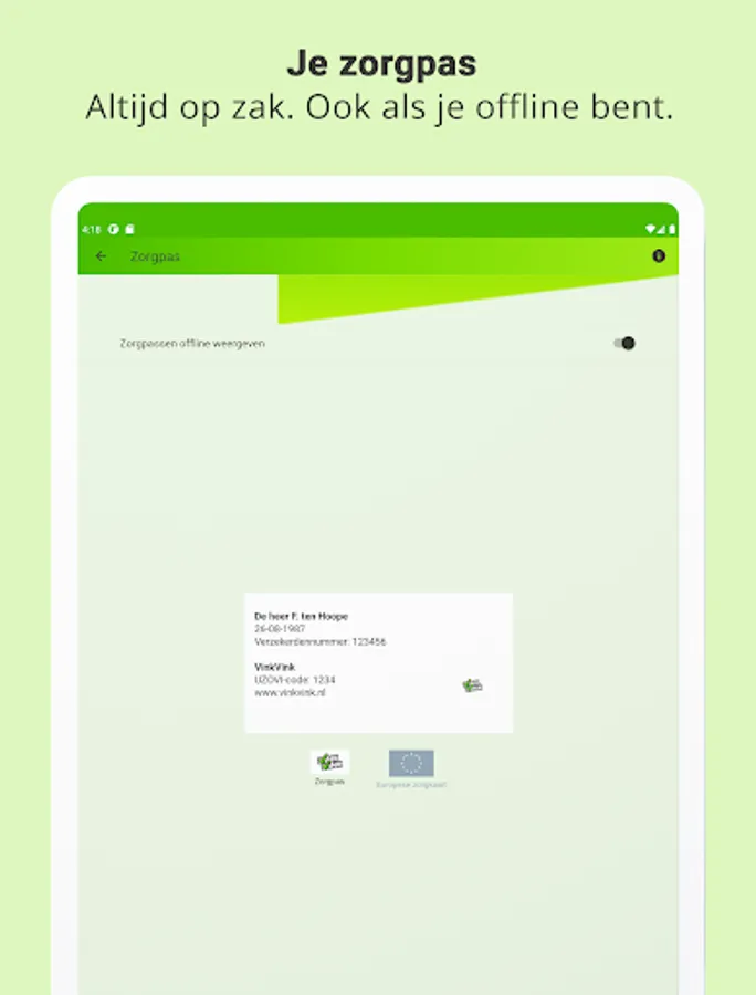 • Need a health card? It is of course in the app. Even if you don't have a connection for a while. Just available offline. No stress.
