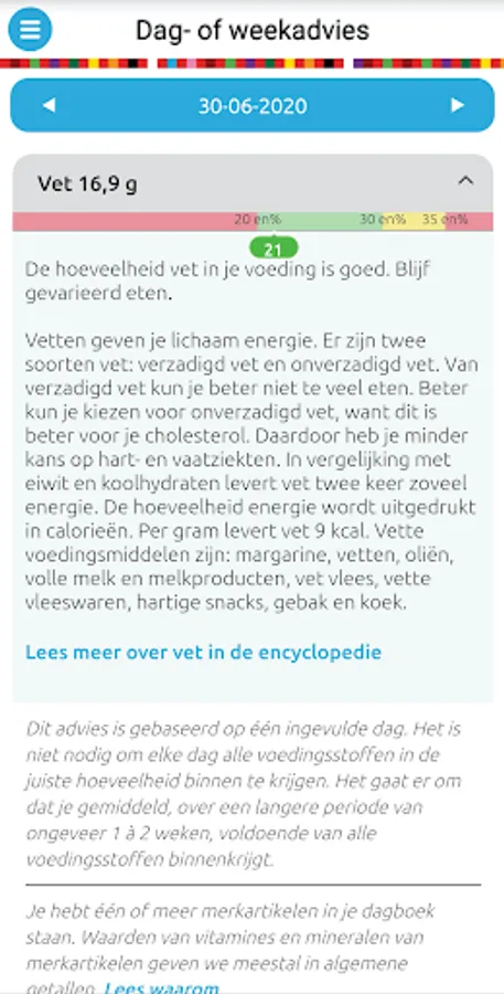 The label states how much energy, fat, saturated fat, protein, carbohydrates, salt and sometimes also fiber is in the product. In Mijn Eetmeter you will immediately receive tailor-made advice for these nutrients. But you can also pay attention to vitamins and minerals in Mijn Eetmeter.