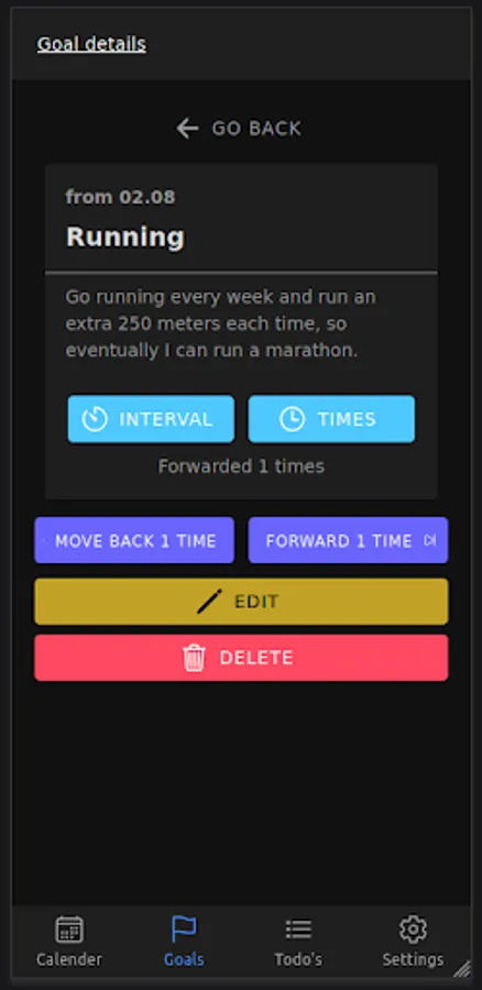 A planner app that helps users establish good routines, set incremental exercise goals, and track progress towards larger objectives in a user-friendly interface. The app allows users to break down larger goals into smaller, manageable sub-goals and track progress over time. It also provides tools to help users establish and stick to healthy routines, such as reminders and progress tracking for exercise and other healthy habits. The app's simple interface makes it easy for users to stay on top of their goals and make steady progress towards achieving them.