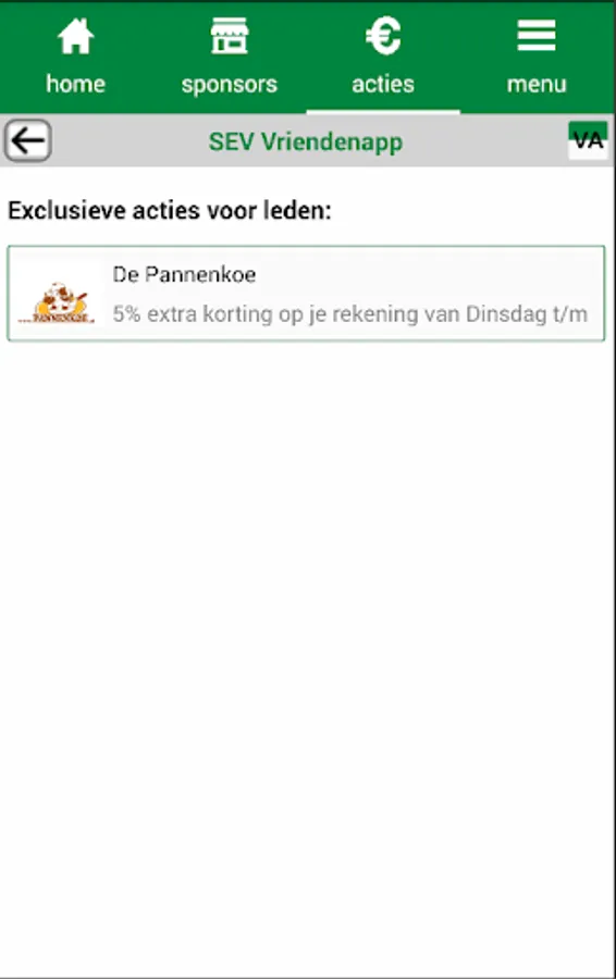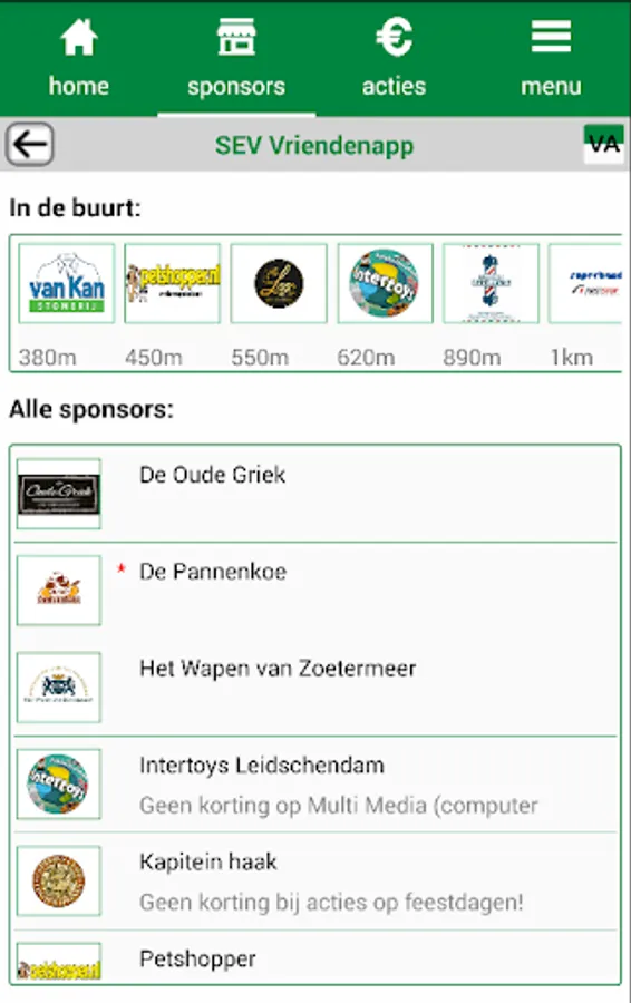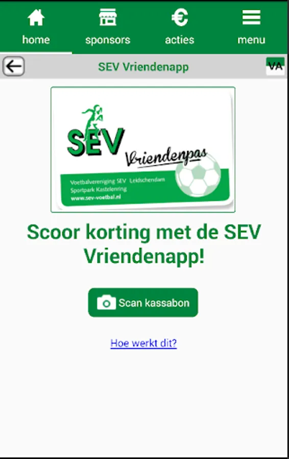 The SEV Vriendenapp is an initiative of the sports association SEV. With this App you can receive discounts on your spending from the participating companies (sponsors). The company where you make your purchase with the SEV Vriendenapp gives a 10% discount on your spending, of which you receive 5% discount directly and the other 5% discount benefits your SEV. This way you not only support yourself, but you also sponsor your club!