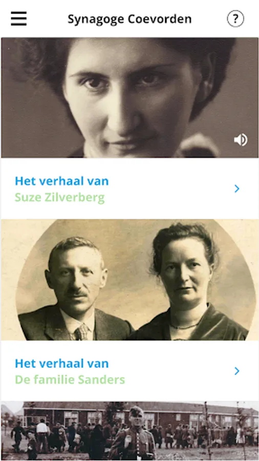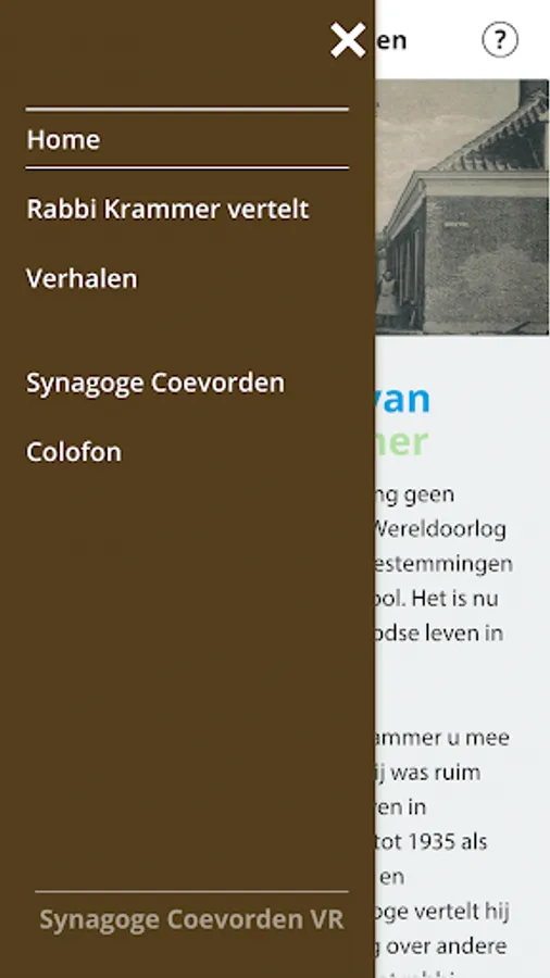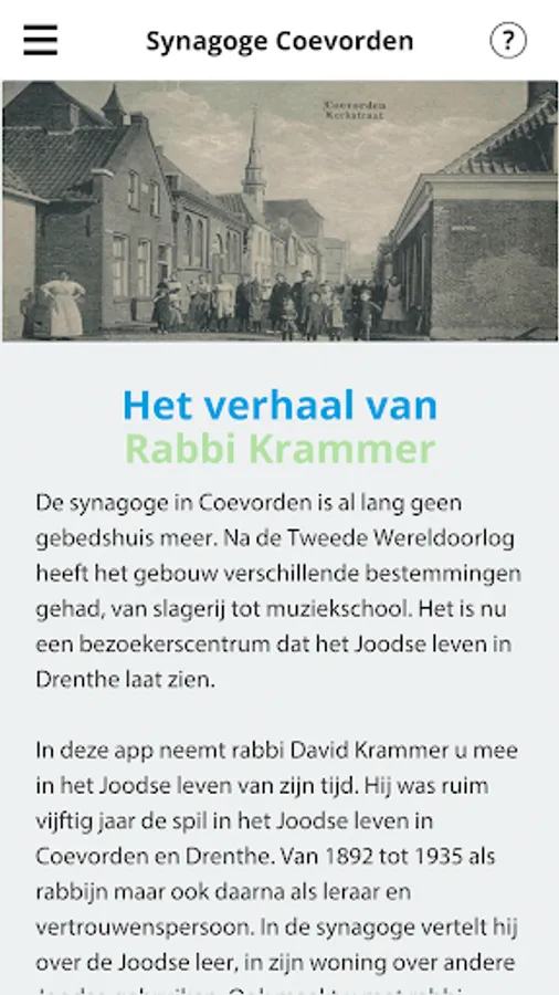 In this app, Rabbi David Krammer takes you into the Jewish life of his time. He was more than fifty years the pivot in Jewish life in Coevorden and Drenthe. In the synagogue he talks about the Jewish teachings, in his home about other Jewish customs. You also make a trip with Rabbi Krammer along important Jewish places in Drenthe. Furthermore, you can hear and read in this app the experiences of other Drenthe Jews.