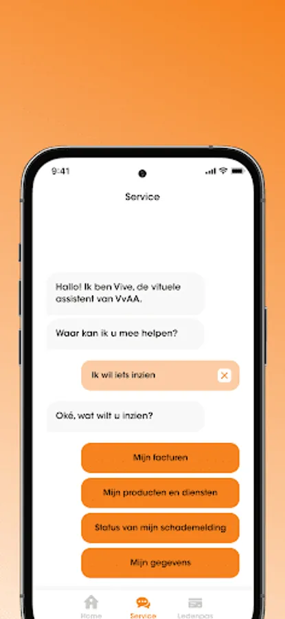 With the VvAA App you can arrange many of your VvAA matters easily, safely and quickly on your mobile phone. For example, you can view your invoices, manage your products and services, easily report damage and change your personal information. And you will receive direct answers to frequently asked questions from our chatbot Vive. If you would like to speak to us, you can do so via live chat and telephone. In the VvAA app you will also find exclusive member benefits and your digital membership card.