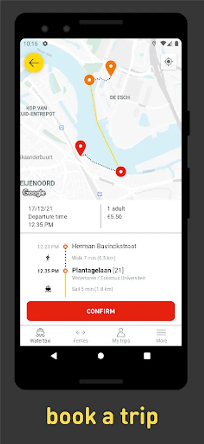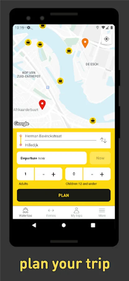 The quickest way to travel is to use our app. You can use it to plan and book your journey in advance. And of course while you are en route. It will tell you immediately within how many minutes the next water taxi will arrive at the desired stop.