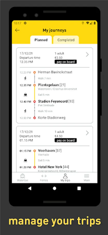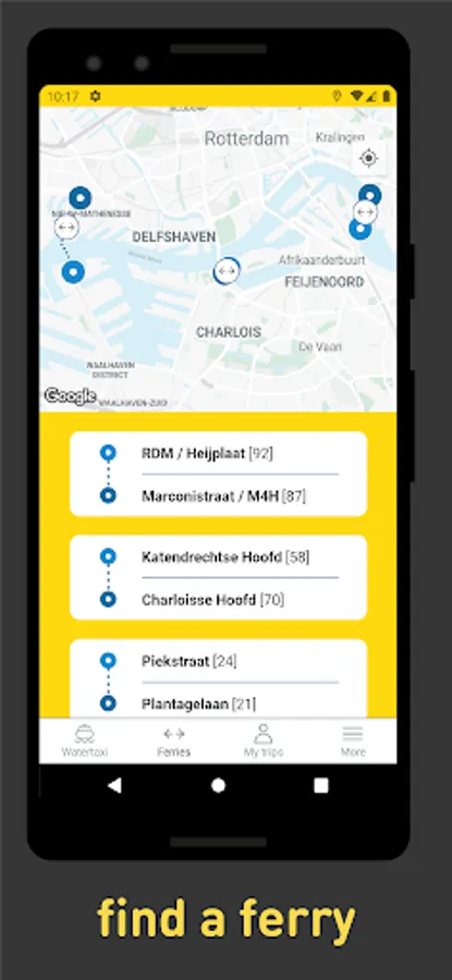 The app shows you all 50 stops in our operating area, plus information on how to transfer to other forms of public transport. It will also tell you how much time you have spent travelling in Rotterdam/Schiedam and show previous journeys you have booked with the app.