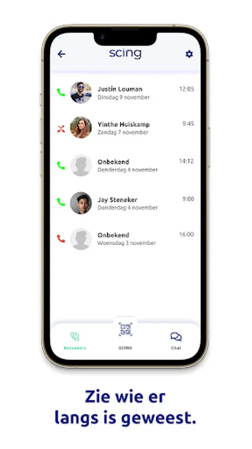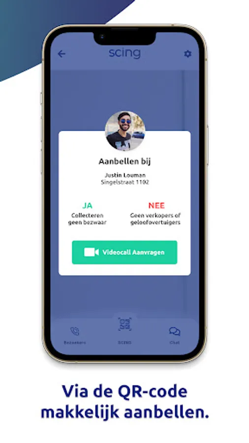 Scing makes it possible to call at a home or company by scanning a QR code. The app contains various options such as a history with visitor list, video call and blocking of unknown persons. The QR code is also easy to scan with a camera app or other QR code scanners.