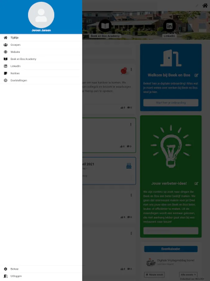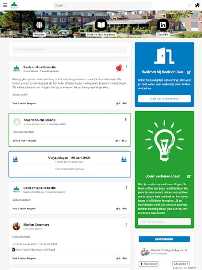 The Beek en Bos app; the online platform for you to quickly and easily share new knowledge, ideas and successes with your colleagues. Thanks to useful features such as a timeline, event calendar, groups and special community promotions, you will be informed in real time about everything that happens at your employer. Thanks to push notifications, you are reminded of reactions from your colleagues, but also of tasks you have to do. This includes preparing your performance review or following up on agreements made for your development plan. All aspects of an innovative progress interview are discussed; your competences, ambitions, training, potential, happiness at work or job satisfaction. Working on your personal goals is easily integrated into your daily work. All new colleagues receive a digital induction program via the app, and departing employees an exit analysis. And there is a fun knowledge quiz or product training regularly.