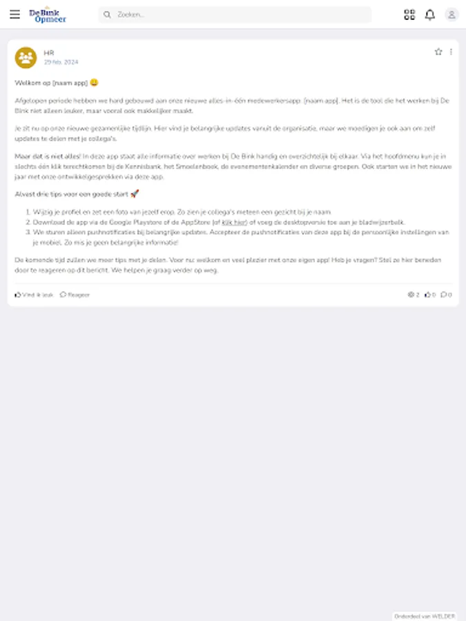 DeBink Opmeer app; the online platform for you to easily and quickly share new knowledge, ideas and successes with your colleagues.