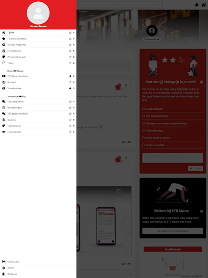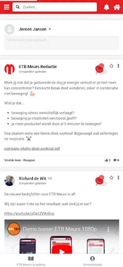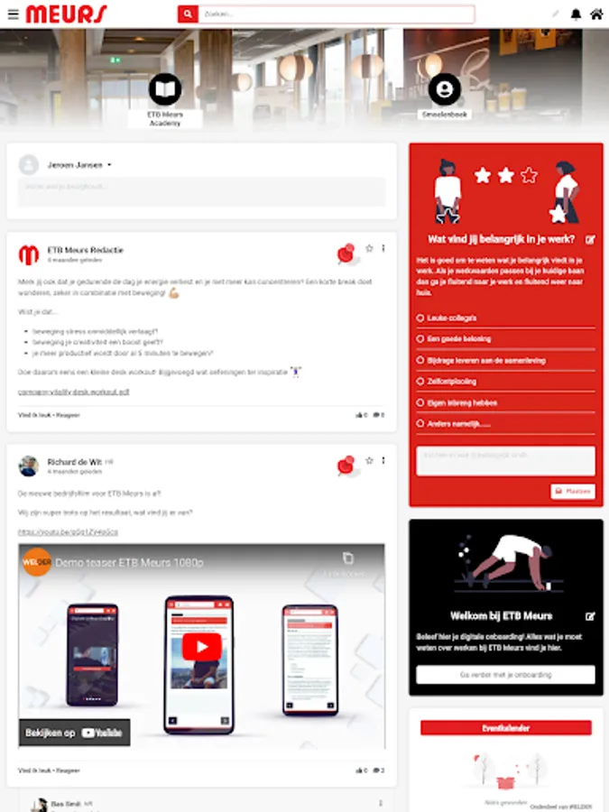 The ETB Meurs app; the online platform for you to easily and quickly share new knowledge, ideas and successes with your colleagues. Thanks to useful features such as a timeline, event calendar, groups and special community promotions, you are informed in real time about everything that happens at your employer. Thanks to push notifications you are reminded of reactions from your colleagues, but also of tasks that you have to do. This includes preparing for your performance review or following up on agreements made for your development plan. All aspects of an innovative progress interview are discussed; your competences, ambitions, education and objectives. Working on your personal goals is easily integrated into your daily work. All new colleagues receive a digital onboarding program via the app, and departing employees receive an exit analysis. And a fun knowledge quiz or product training comes along regularly.