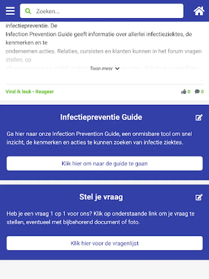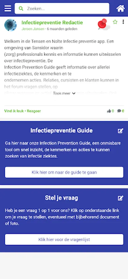Welcome to the Tensen and Nolte Infection Prevention app. A Sansidor environment in which (healthcare) professionals can exchange knowledge and information about infection prevention. The Infection Prevention Guide provides information about all kinds of infectious diseases, their characteristics and actions to be taken. Relations, course participants and customers can ask questions, respond to each other and actively exchange knowledge in the forum. You can also ask specific questions about Infection Prevention within your institution under the Ask your question section and we will get back to you shortly.