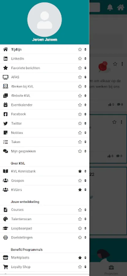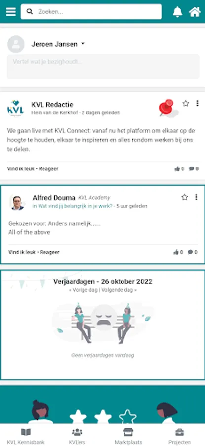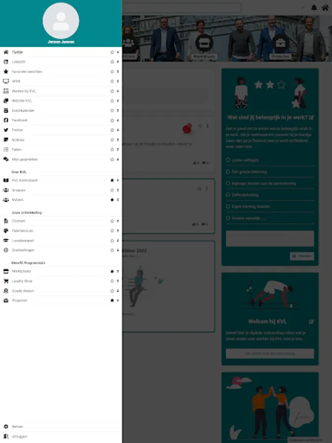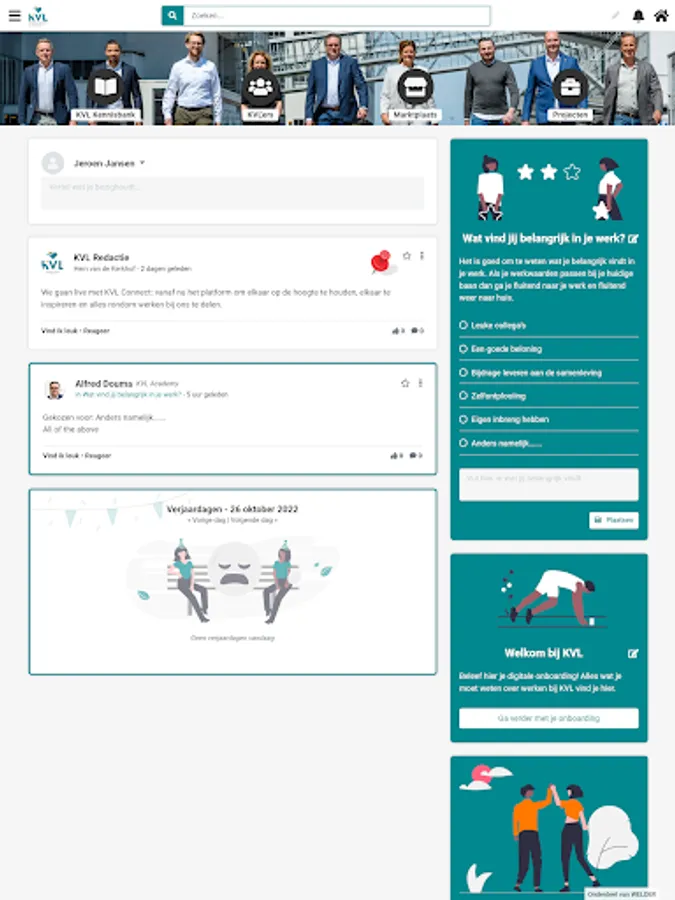 The KVL Connect app; the online platform for you to easily and quickly share new knowledge, ideas and successes with your colleagues. Thanks to handy features such as a timeline, event calendar, groups and special community promotions, you are informed in real time about everything that is happening at your employer. Thanks to push notifications, you are reminded of reactions from your colleagues, but also of tasks that you have to do. Think of preparing your performance interview or following up on agreements made for your development plan. All aspects of an innovative progress meeting are discussed; your competences, ambitions, training and objectives. Working on your personal goals is easily integrated into your daily work. All new colleagues receive a digital induction program via the app, departing employees an exit analysis. And there is regularly a nice knowledge quiz or product training.