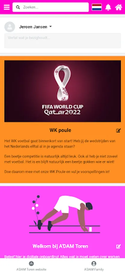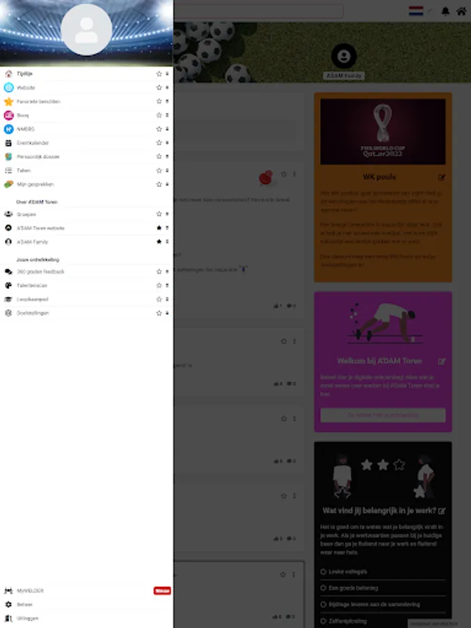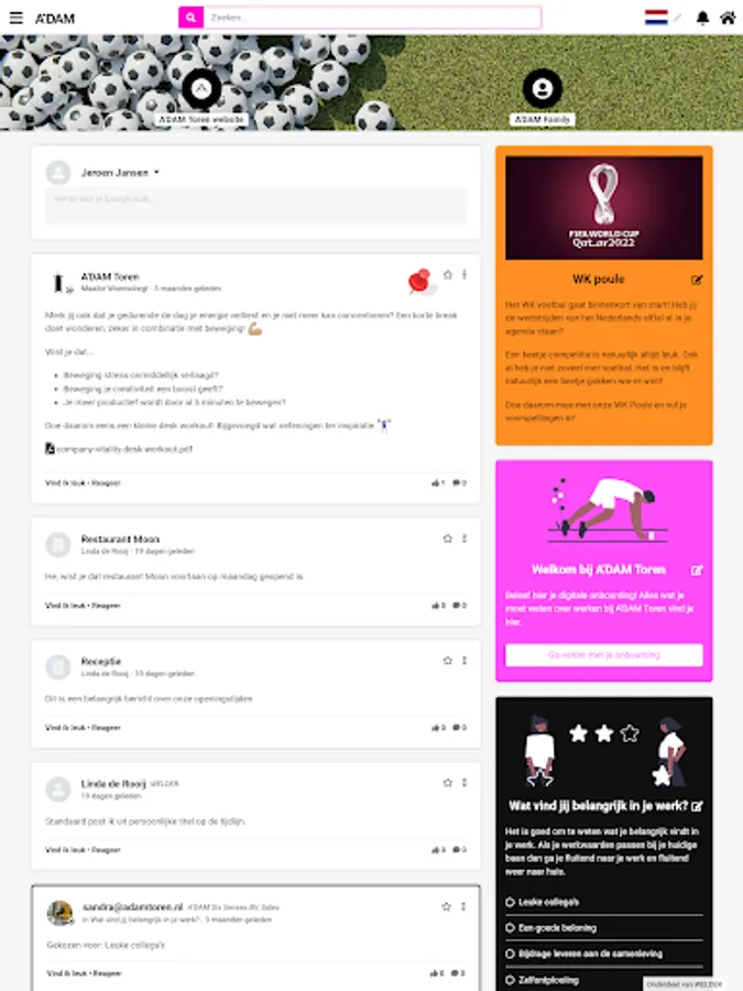 the myA'DAM app; the online platform for you to easily and quickly share new knowledge, ideas and successes with your colleagues. Thanks to useful features such as a timeline, event calendar, groups and special community promotions, you are informed in real time about everything that happens at your employer. Thanks to push notifications you are reminded of reactions from your colleagues, but also of tasks that you have to do. This includes preparing for your performance review or following up on agreements made for your development plan. All aspects of an innovative progress interview are discussed; your competences, ambitions, education and objectives. Working on your personal goals is easily integrated into your daily work. All new colleagues receive a digital onboarding program via the app, and departing employees receive an exit analysis. And a fun knowledge quiz or product training comes along regularly.