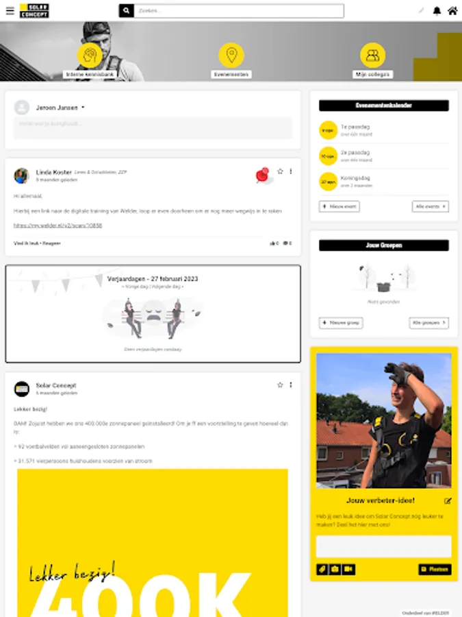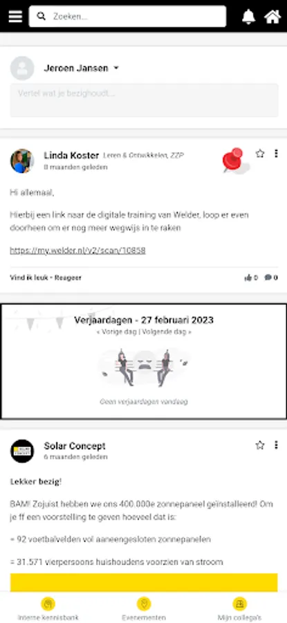 The SC employee app; the online platform for you to easily and quickly share new knowledge, ideas and successes with your colleagues. Thanks to useful features such as a timeline, event calendar, groups and special community promotions, you are informed in real time about everything that happens at your employer. Thanks to push notifications you are reminded of reactions from your colleagues, but also of tasks that you have to do. This includes preparing for your performance review or following up on agreements made for your development plan. All aspects of an innovative progress interview are discussed; your competences, ambitions, education and objectives. Working on your personal goals is easily integrated into your daily work. All new colleagues receive a digital onboarding program via the app, and departing employees receive an exit analysis. And a fun knowledge quiz or product training comes along regularly.